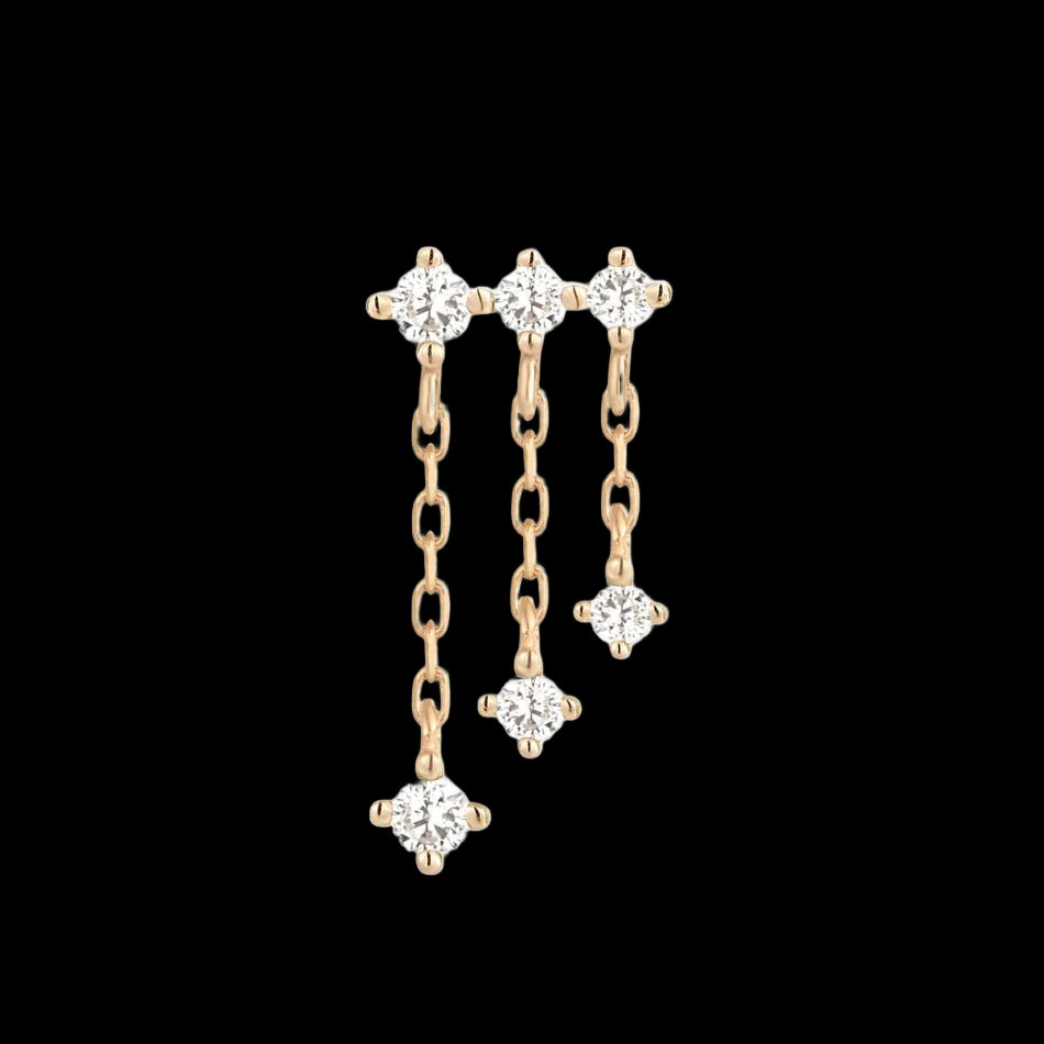 Swimming in sparkles, "Cascade" mimics a breathtaking waterfall, freefalling into a plunging pool. Three CZs line the edge and support three CZs delicately dangling from below in descending order. Add Cascade to your helix, flat, or rook for an eye-catching centerpiece.