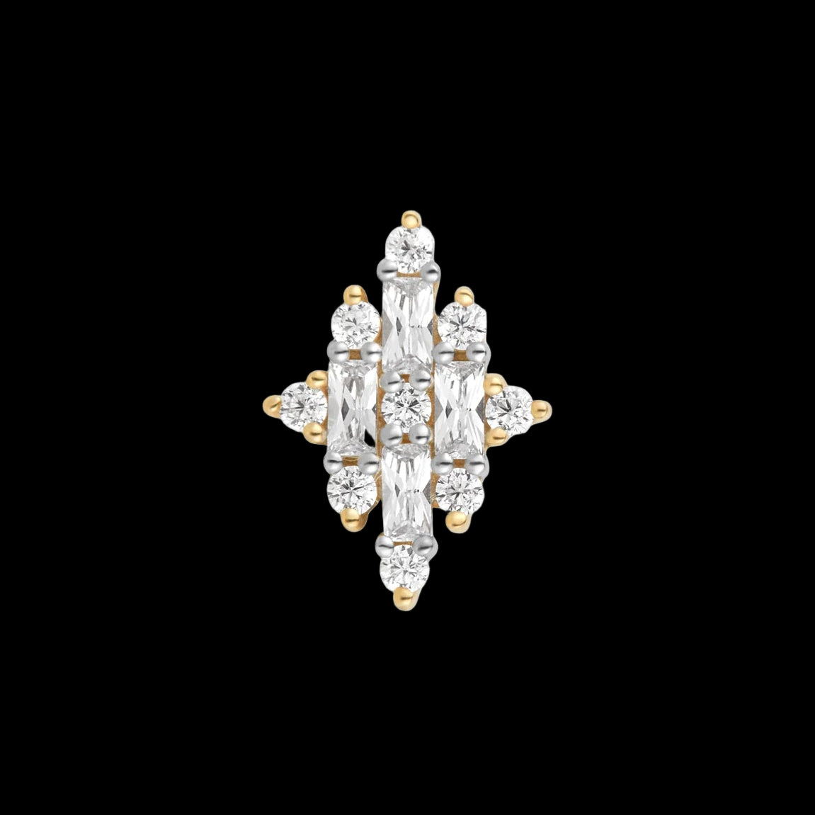 Whimsical and as sparkling as the inspiration behind its name, "Celebration" is here to help you kick off the party this holiday season. Adorned with 15 CZs, this bright piece stands out from any other design we've released. It introduces a new concept with white gold prongs at the center, enhancing the overall luminosity of the design in any light.