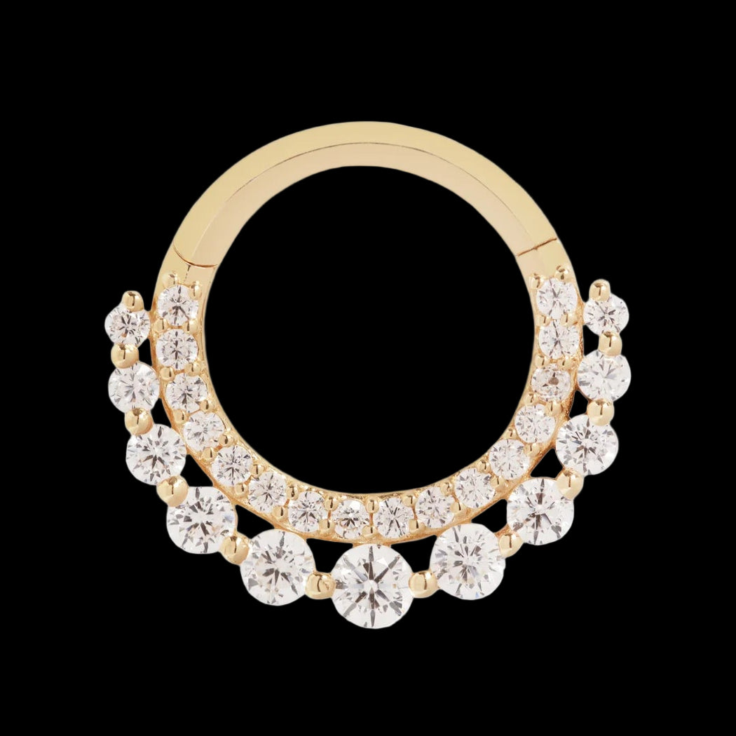 The "Gl’amor" clicker is pure sophistication, designed to shine in septum or daith piercings. With two rows of round faceted CZs set in solid yellow gold, this piece brings a touch of high-fashion sparkle to any look.