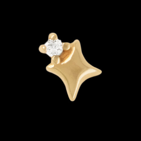 "Star Stuff" offers you a unique way to add natural diamond luxury with a celestial-inspired design. Featuring a four-pointed star and a single round-cut genuinediamond at the center, this piece adds refined sparkle to any curation. A perfect blend of elegance and versatility, Starstuff brings the brilliance of diamonds to your clients' piercings.